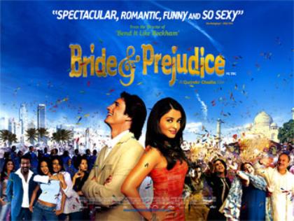 I assume that the movie has a similar narrative to 'pride & prejudice' due to the way it has played with the name of the film. The two main protagonists appear in the central image will be the 'Mr. darcy' and 'Elizabeth' of the film as they appear to be a couple, alluding the film has something to do with love and relationships. On the right hand side, the Taj Mahal is seen, which would be the females background and on the left hand side, a there is the skyline of a western country, which would be his background. This suggests that there is culture differences, creating a conflict between the two lovers, which would be the main source of problem in the film. Perhaps, instead, it suggests the merging of cultures and how they bond over time. The genre would be romantic comedy, suggested by the reviews at the top of the poster. I would say that the target audience is 15 - 35, and mainly a female demographic.
